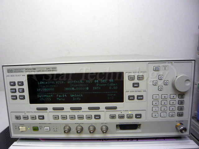 シンセサイズド・スイーパ, 10MHz〜20GHz(高出力), 分解能1Hz(op.008), 安定度5x10*-10/日, 出力レベル+17〜-110dBm(op.001), 最大出力+17dBm, 高調波-25dBc, 3.5mm, 50Ω, GPIB付, オプション001:(アッテネータ追加)